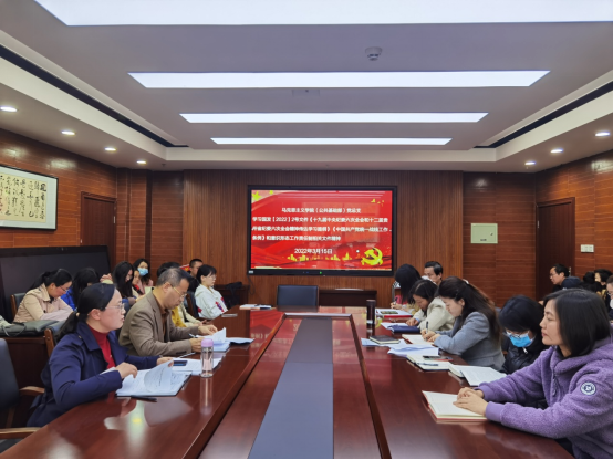 为深入学习贯彻习近平新时代中国特色社会主义思想和习近平总书记最新重要讲话精神,及时推动党的创新理论进教材、进课堂、进头脑,马克思主义学院(公共基础部)党总支于2022年3月15日下午2:00在学校行政楼五楼会议室开展部门党总支政治理论学习。
